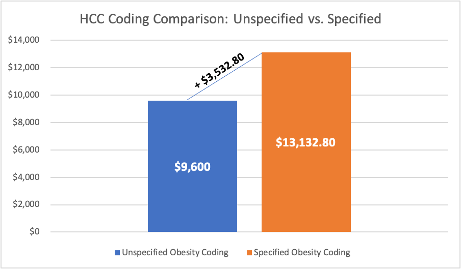 A single patient example helps to convey how critical it is to ensure accurate coding for patients. A female with a weight of 240 lbs. resulting in a BMI of 44 is diagnosed with obesity using ICD-10 code E66.9. This unspecific obesity diagnosis code for this patient has no HCC relevance, which means the patient’s RAF score remains at .000 and payers are unaware of the risk this patient’s weight has on her health and potential cost of care. The more precise and accurate coding of morbid obesity using the E66.01 Dx code would result in a RAF score of .368 for that patient. Figure 1 demonstrates the financial result of more accurate coding for this (normally $800 per member per month costing) patient based only on the addition of a more precise diagnosis coding.