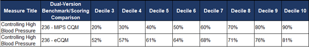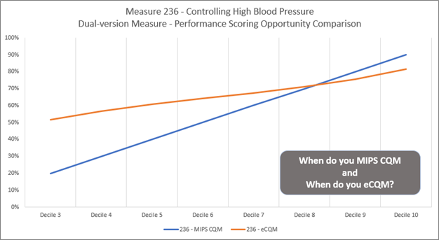 From a performance and scoring perspective, dual-version measures each have their own individual benchmarks. For example, there is a different set of performance deciles for the MIPS CQM (registry) version of measure 236 – Controlling High Blood Pressure and the eCQM version of the same measure (see benchmarks table and image below). Since there are two different benchmark lines for each measure collection method, a practice can benefit by choosing the optimally scored version of the measure even if performance changes throughout the year. For example, if a practice’s performance rate on measure 236 lingers below 60% throughout the year, it would be beneficial for that practice to get scored on the registry version of the measure. If, however, that performance rate changes and goes above 65% then the eCQM would be the better scored. Each version of the measure will have its own performance rate metric and each metric is scored against the individual collection method benchmarks. The question ultimately just becomes, “when do you use MIPS CQM and when do you use eCQM?”