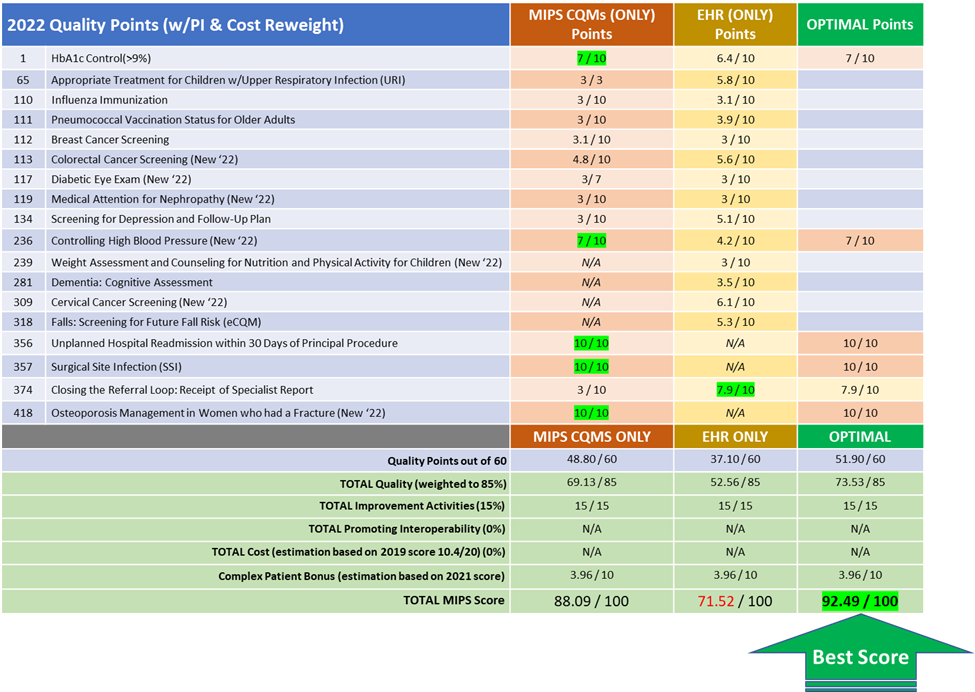 • The green column shows how, through reporting with ReportingMD, this practice can choose the best of the best scores across both versions, which would result in a MIPS CPS score of 92.49. This optimized score is estimated to bring in about $416,218 in MIPS revenue for the organization in 2024.