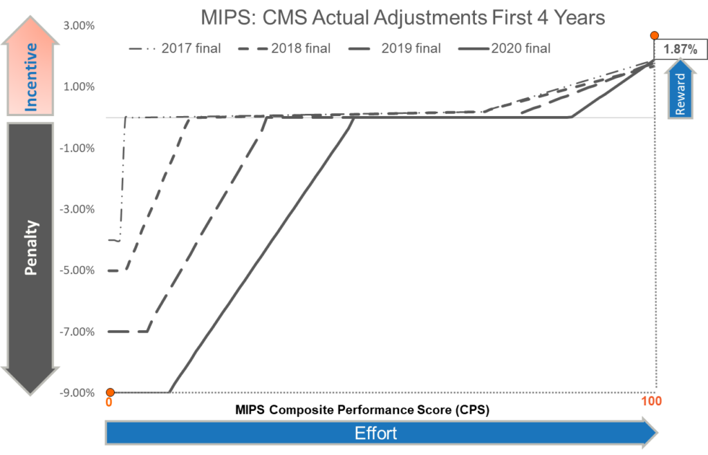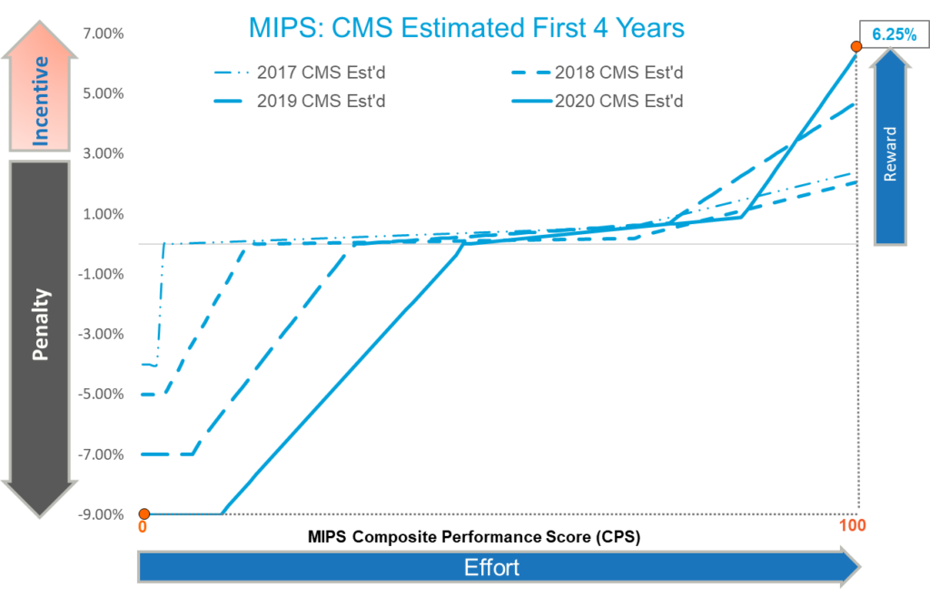 The QPP’s first year was designated as a “transition year” in that several less stringent options were offered to QPP participants allowing them to avoid financial penalties while they chose a pathway under the new Medicare and CHIP Reauthorization Act (MACRA) Value Based Care (VBC) models and their underlying objectives. After the initial transition year, the effort requirements and relative penalties/rewards were expected to grow substantially as the MIPS program years went on. Figure 1 below is the graphical representation of what CMS realistically touted as the expected effort and resulting penalties/rewards (per annual rulemaking scaling factor estimates for incentive rates).